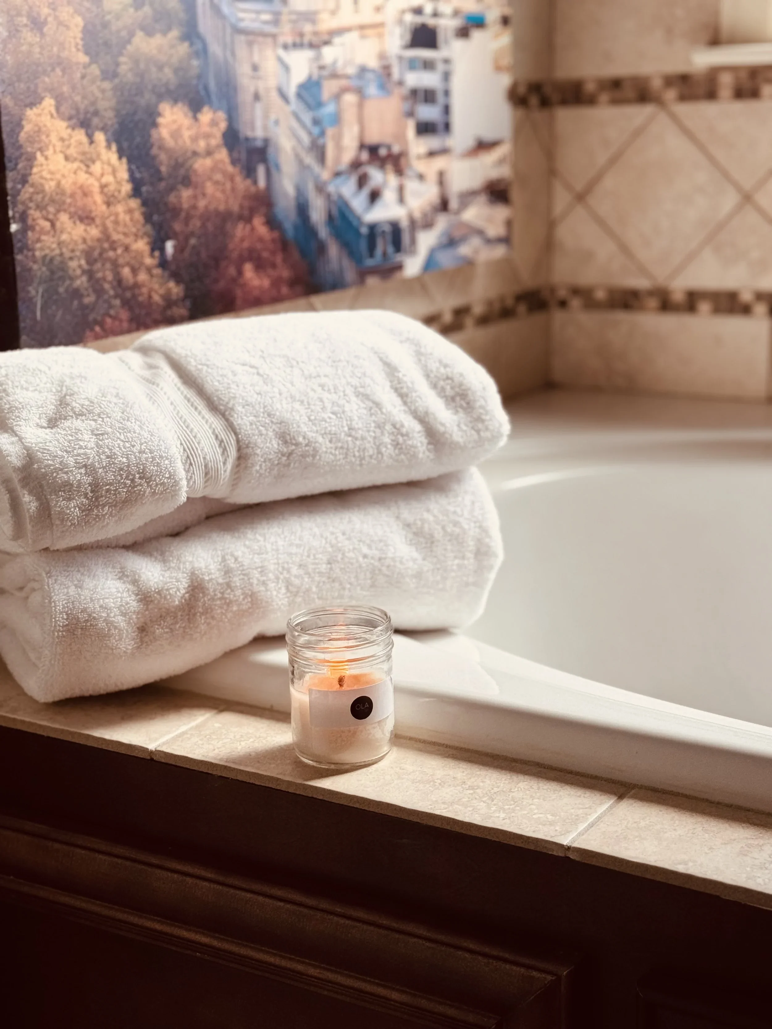This is where spa moments happen, even if it’s just five quiet minutes at the end of a long day. Go for calming scents like eucalyptus, lavender, or sea salt. A single candle by the tub or sink brings a sense of ease and care to the space.
